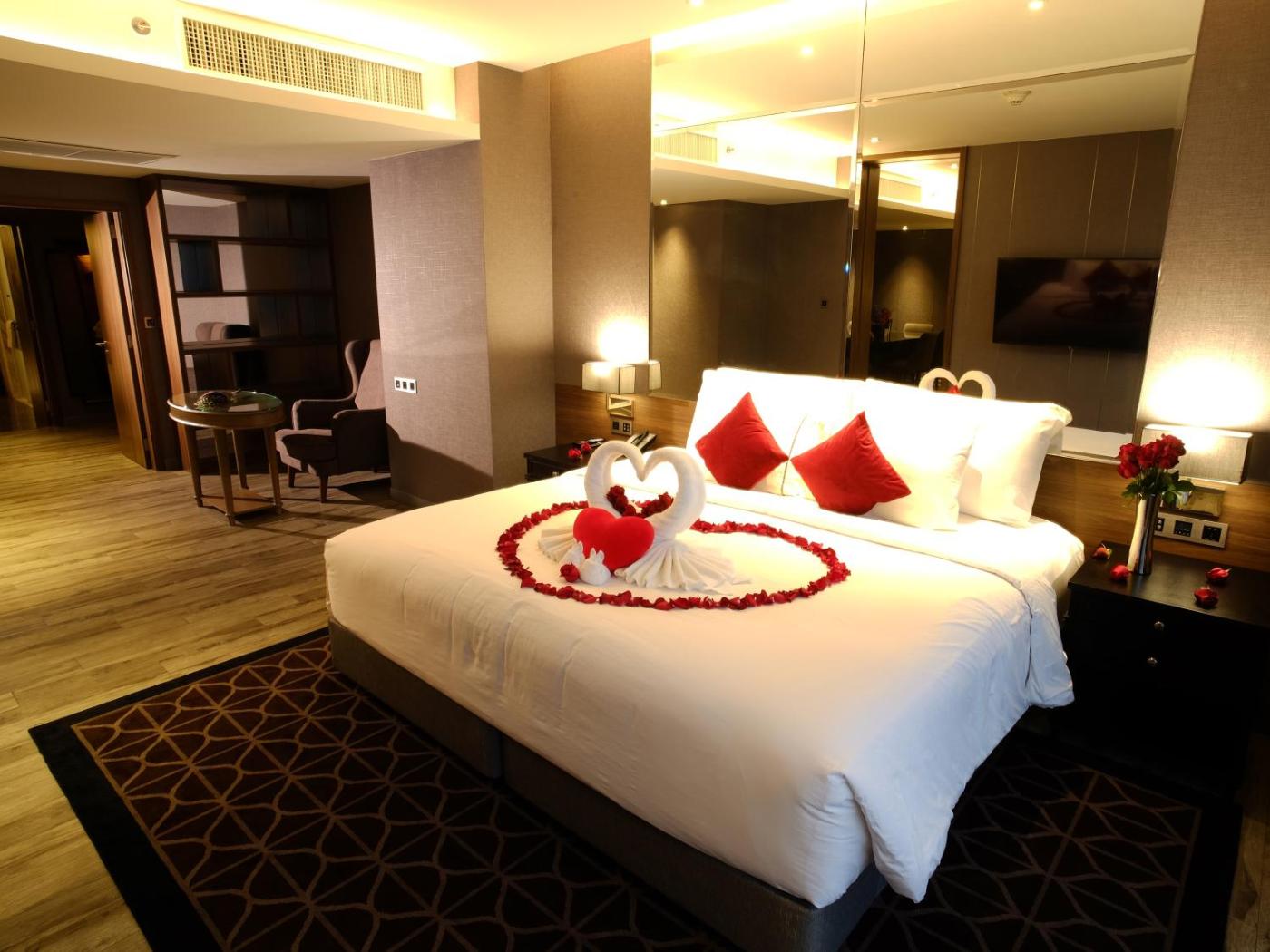 Deluxe King Suite. This spacious suite consists of 1 living room, 1 separate bedroom and 2 bathrooms with a bath and free toiletries. The air-conditioned suite provides a flat-screen TV with satellite channels, a minibar, a seating area, a safe deposit box as well as city views. The unit offers 2 beds. ;