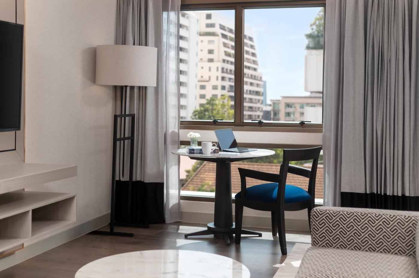 The spacious rooms at the Radisson Hotel Chateau de Bangkok come with modern décor, and are fitted with floor-to-ceiling windows. They are equipped with a flat-screen cable TV, teacoffee making facilities, safe and marble bathroom.