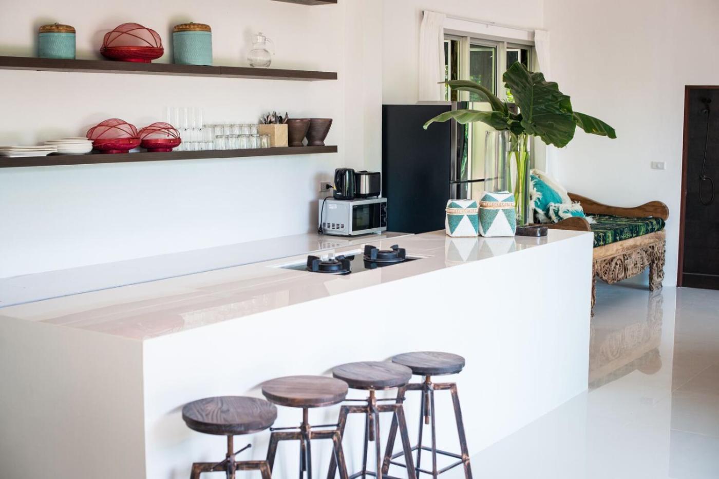 Three-Bedroom Villa. This villas special features are the pool with a view and the hot tub. Featuring a private entrance, this air-conditioned villa comprises a kitchen, 3 bedrooms and 3 bathrooms with a bath and a shower. The well-equipped kitchen features a stovetop, a refrigerator, kitchenware and an oven. Boasting a terrace with garden views, this villa also provides soundproof walls and a flat-screen TV. The unit offers 4 beds.